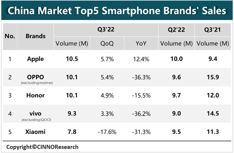 CINNO Research统计数据显示,今年第三季度,中国大陆市场智能手机销量约为6220万台,同比下降20.8%,是2015年以来最差的“第三季度”。