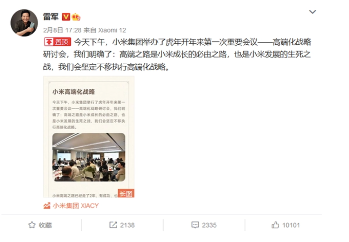 “高端之路是小米成长的必由之路,也是小米发展的生死之战,我们会坚定不移执行高端化战略。”今年2月,雷军重申小米的高端化战略时,将苹果视为对标对象。“产品和体验要全面对标苹果,三年内拿下国产高端手机市场份额第一。”