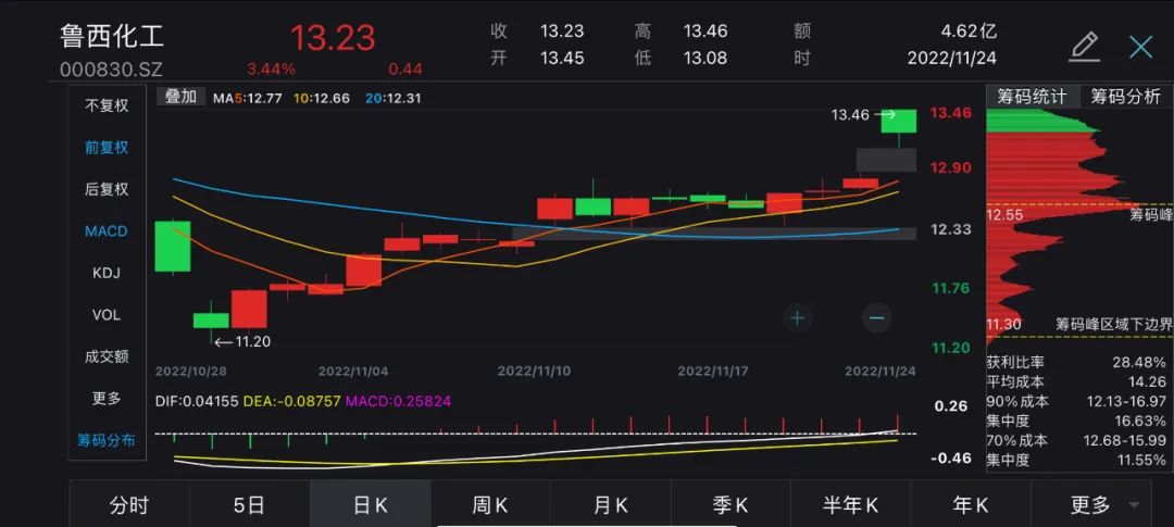 11月24日,鲁西化工(000830.SZ)跳空高开涨超5%,盘中最高报13.46元创近3个月新高价。截至当日收盘,鲁西化工报收13.23元/股,涨幅3.44%,总市值254亿元。
