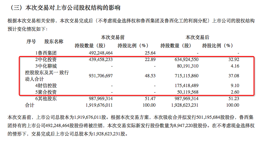 据鲁西化工披露,交易完成后(不考虑现金选择权和鲁西集团及鲁西化工的利润分配)公司的股权结构预计变化情况为: