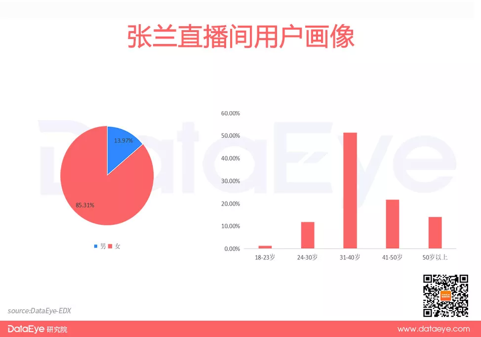张兰直播间粉丝女性占比高达85%以上,31-40岁用户超半数,用户主要分布在上海、北京、天津等一线及新一线城市。该群体的用户大多已经结婚、事业有成、甚至有孩子,拥有职场女性和孩子妈妈双重身份,追求性价比也有极强的消费力。
