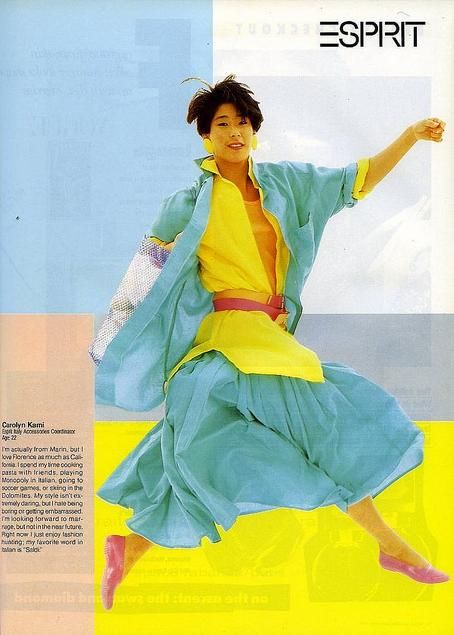 1968年,Doug Tompkins和前妻Susie Tompkins(他们亦是The North Face的创始人)在旧金山创立了Esprit。而这个品牌的流行,和当时盛行的嬉皮文化有着极大关系:初期,这对夫妇在他们的大众迷你巴士(Volkswagen Bus)里贩售Esprit服饰的行为一度被视为嬉皮佳话——就连那辆大众巴士,也曾经是嬉皮文化的重要象征。此后,伴随着启用艺术家、建筑师作为广告模特并在广告宣传中插入社会话题等做法,Esprit逐渐超越单纯的服装层面,成为一个人文气息浓郁的品牌——“在我们的印象里,Esprit是第一个不拘泥于时装领域的品牌”,Opening Ceremony创始人、同时也是Kenzo创意总监的Carol Lim和Humberto Leon说。