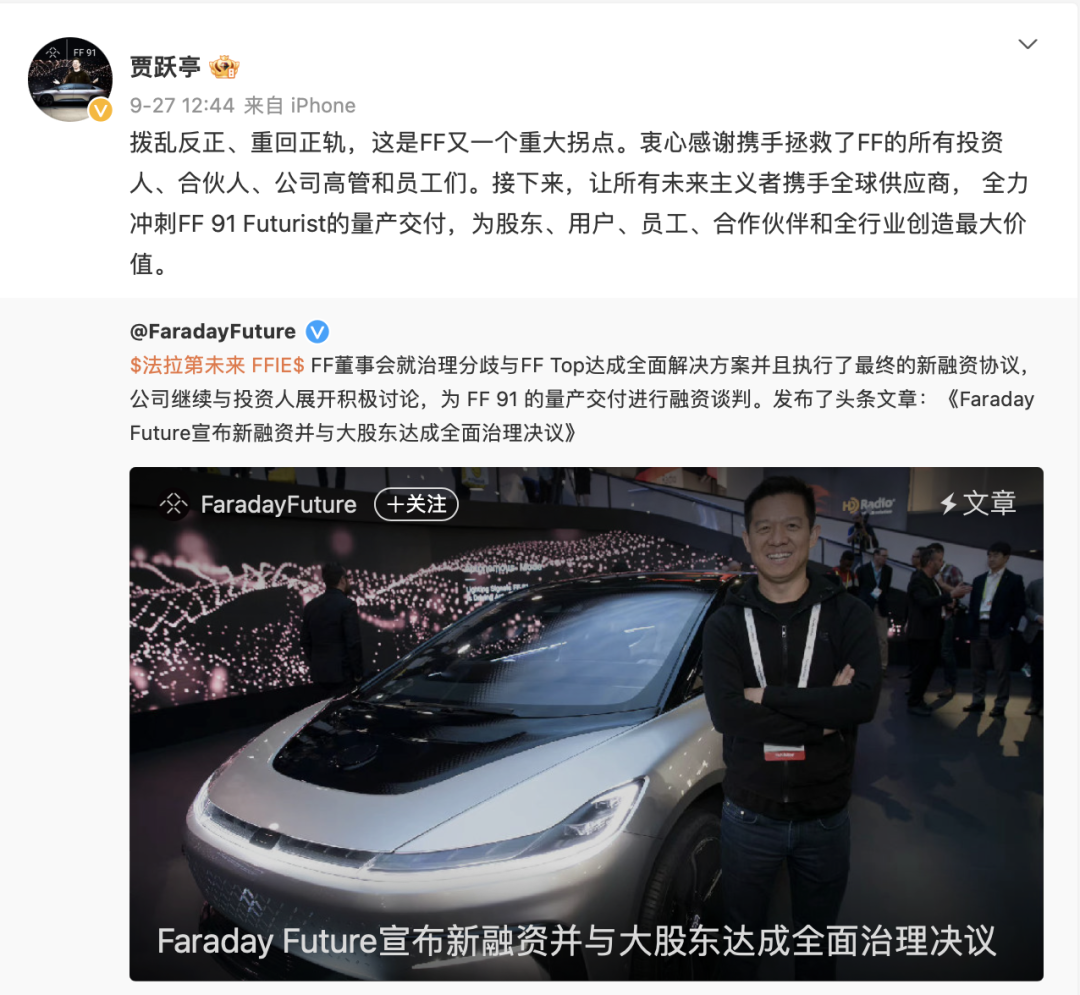 9月27日下午,数月未出现在公众视野的贾跃亭转发了FF发布的一篇名为《Faraday Future宣布新融资并与大股东达成全面治理决议》的通稿。决议中的重点便是,FF TOP撤回诉讼,同时FF会陆续分批收到总额为1亿美元的融资,届时公司董事苏珊 斯文森(Sue Swenson)和布莱恩·克劳利克将陆续辞去相应职务。