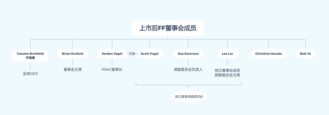 2021年3月31日,上市筹备期间,FF发布了一则任命通知。该任命中写到,任命9名全球董事会成员,将在与PSAC的合并交易完成后生效。新董事会将由包括科技、汽车、金融、政府和监管、交通和能源等不同行业的专家组成。包括FF全球首席执行官Carsten Breitfeld(毕福康)、现任FF董事会成员Brian Krolicki、Matthias Aydt、Christine Harada、Lee Liu(刘辉)、Sue Swenson、Jordan Vogel、Scott Vogel和Bob Ye(叶青)。