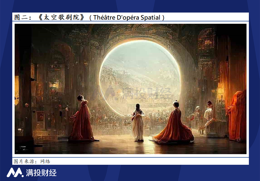 而真正点燃AI绘画的引线,令其从小众进入到大众视野的,则是在2022年8月美国科罗拉多州艺术博览会上取得了数字艺术类冠军的名为《太空歌剧院》的AI绘画作品。从画面上看,这个作品风格极为细腻,与人类的绘画作品几乎没有差别,但它却是用Midjourney生成的,其创作过程远不如人类绘画作品复杂,也无需技术背景。