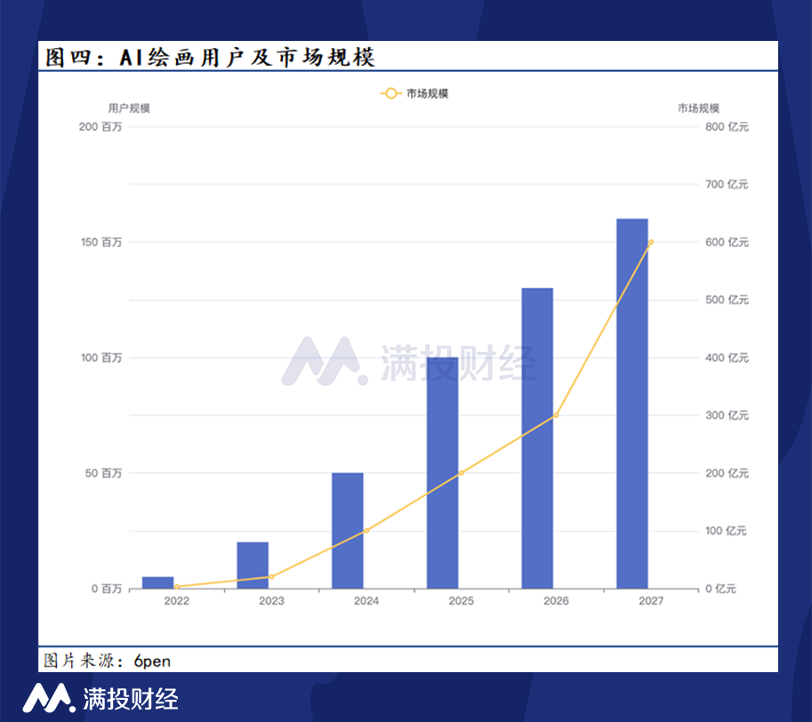 在市场空间上,根据6pen预测,光是在未来5年全世界或许就会有10%-30%的图片内容由AI生成或辅助生成,其对应的市场规模将超过600亿元,而若是互联网完成了Web2.0到Web3.0的过渡,那么在那之后的市场规模则还会更大。