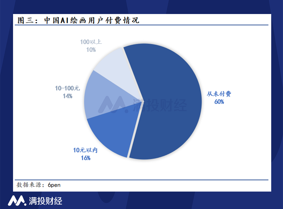与此同时,对于市场参与者来说,目前AI绘画的商业化也尚处早期。据6pen的问卷调查,大部分的受访者都表示从未对AI绘画付费,付费超过100元的则仅为10%,C端用户的付费意愿显然只能用“极低”来形容。对此,或许AI绘画平台可以从B端入手寻找机会,但从现如今各大平台的商业模式来看,大部分的AI绘画服务都是通过限制生成次数等方式按量收费,并没有区分C端B端,而版权问题也让AI绘画在B端市场的拓展上处处受限,商业化长路漫漫。