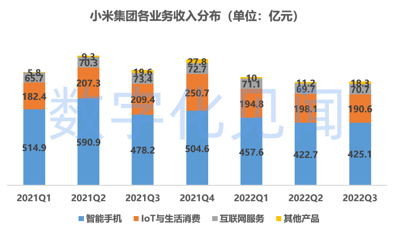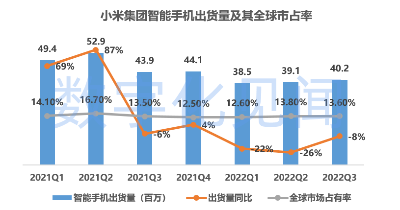 根据Canalys报告,2022年三季度是手机市场过去九年以来表现最为糟糕的第三季度。成熟度相对处于“夕阳产业”的智能手机厂商再遇上经济下行、疫情反复、局部区域冲突等宏观环境,想要保持业务的增长可谓是十分困难,在此背景下,小米智能手机业务受到波及也在所难免。