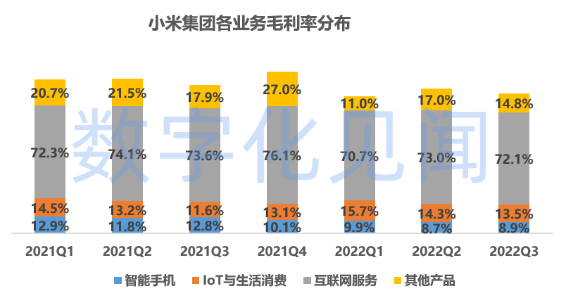 数字化见闻从拉长至近两年的数据看到,智能手机业务的毛利率也是下滑最为明显,从2021Q1的12.9%降至2022Q3的8.9%,毛利率减少了4%,同期IoT与生活消费业务、互联网业务仅分别减少1%、0.2%。