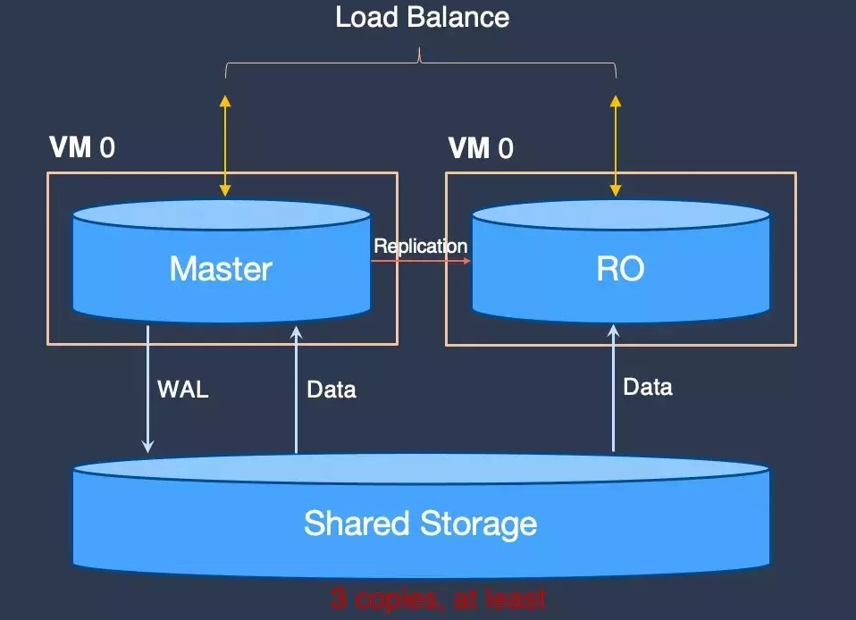 针对这些问题,可选解决方案是基于共享存储,即数据库共享存储方案:RDS 实例(一般指一主一从的高可用实例)和只读实例共享同一份数据。好处是实例故障或只读扩展时,不用拷贝数据,只需新建只读计算节点或把故障节点重新拉起来。并且,通过快照技术和写时拷贝解决数据备份和误操作恢复问题。不过,业内可用的共享存储方案非常少,即使可用,性能也达不到要求。