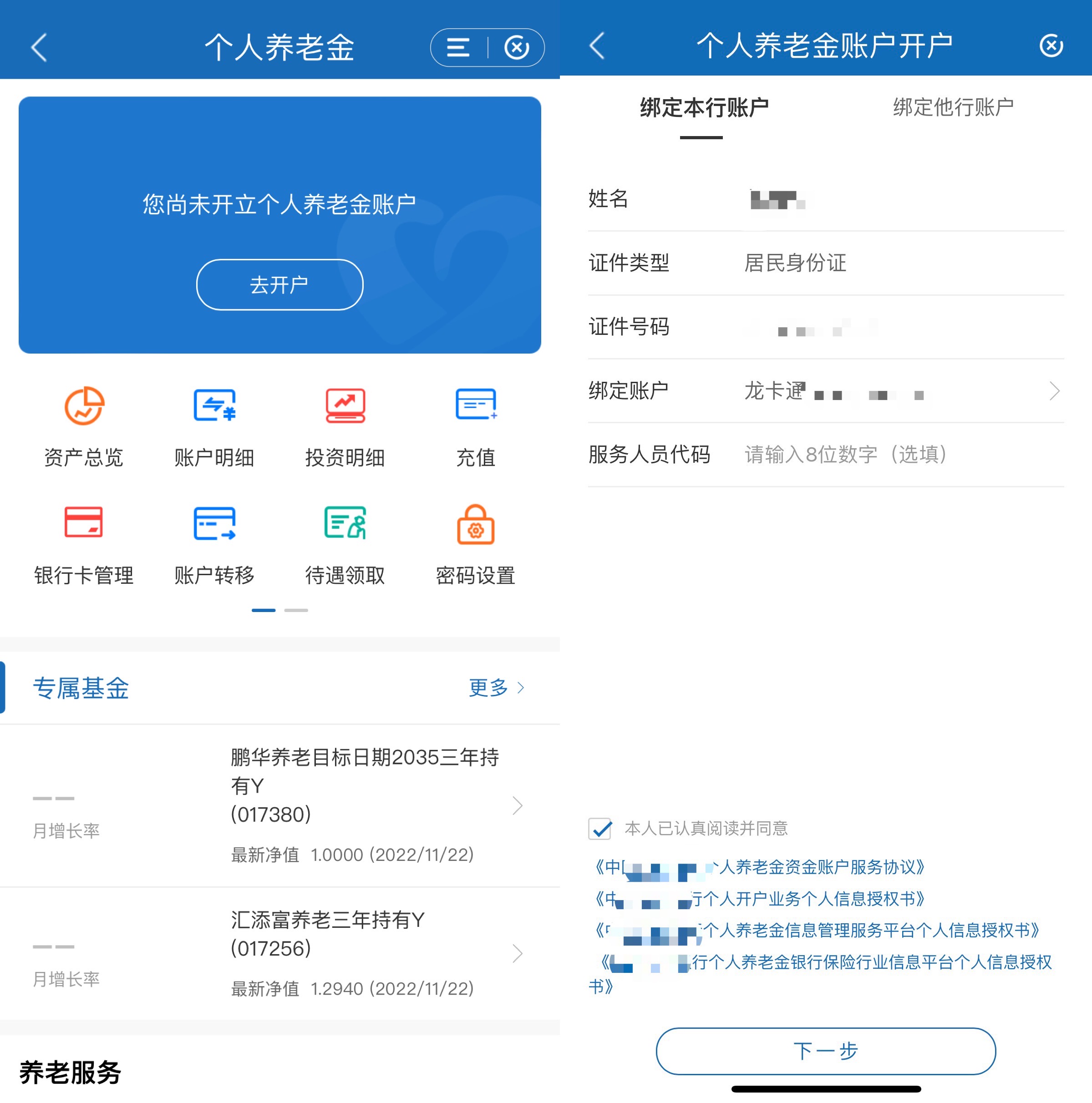 界面新闻记者测试发现,通过某国有大行的App,搜索“个人养老金”即可进入个人养老金账户开户页面,随后绑定银行卡账户,勾选阅读并同意《个人养老金自己账户服务协议》、《个人开户业务个人信息授权书》、《个人养老金信息管理服务平台个人信息授权书》、《个人养老金银行保险行业信息平台个人信息授权书》等协议后,并通过刷脸验证即可开通账户,操作过程简单快捷。