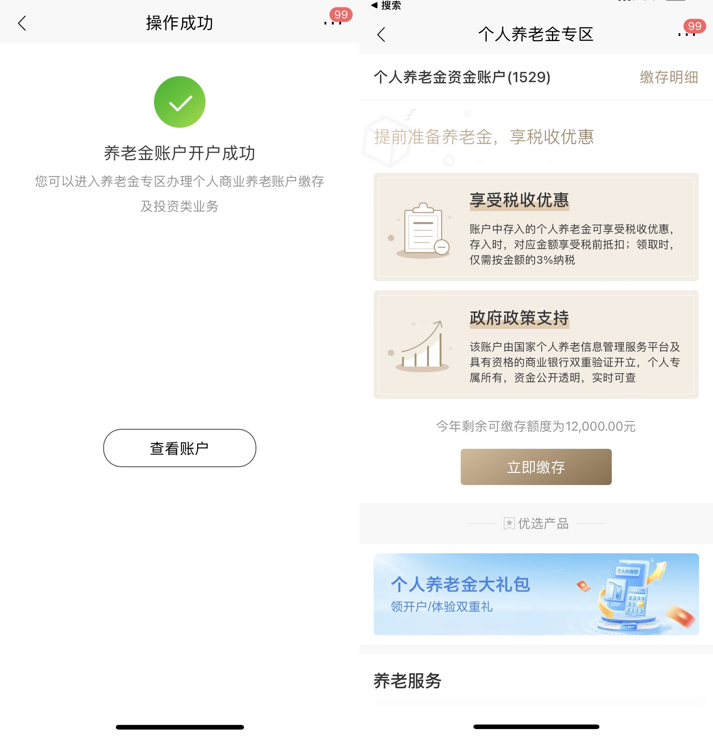 在某股份行App上,界面新闻记者同样搜索“个人养老金”,通过手机验证码、人脸信息、个人支付密码核验身份后,即可开通该行的个人养老金账户,开户过程仅需1分钟。