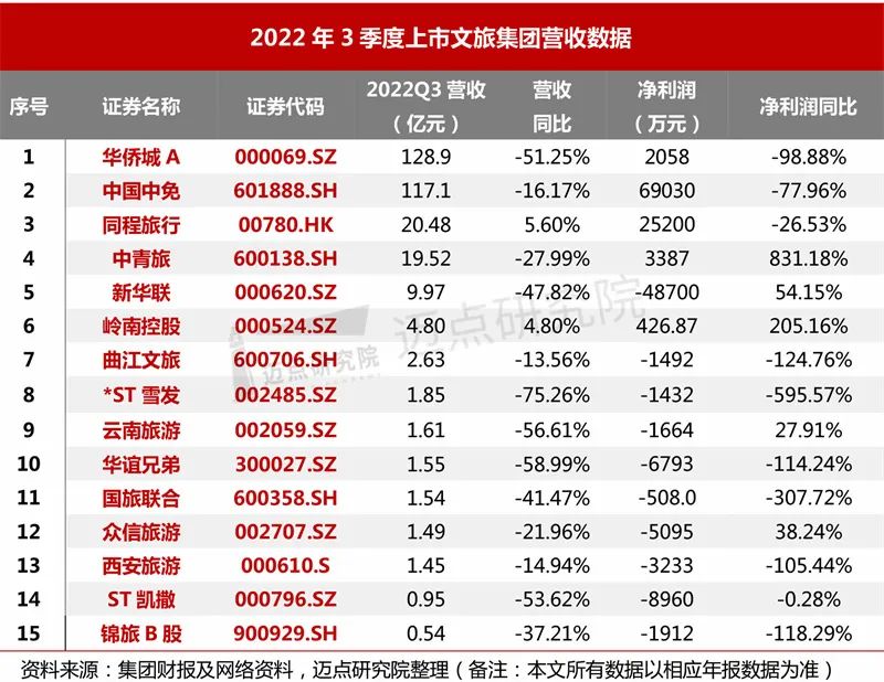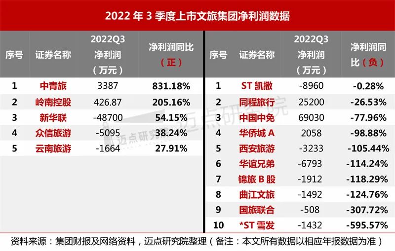 2022Q3文旅集团净利润概况:亏损为主基调,约七成企业净利润同比为负增长