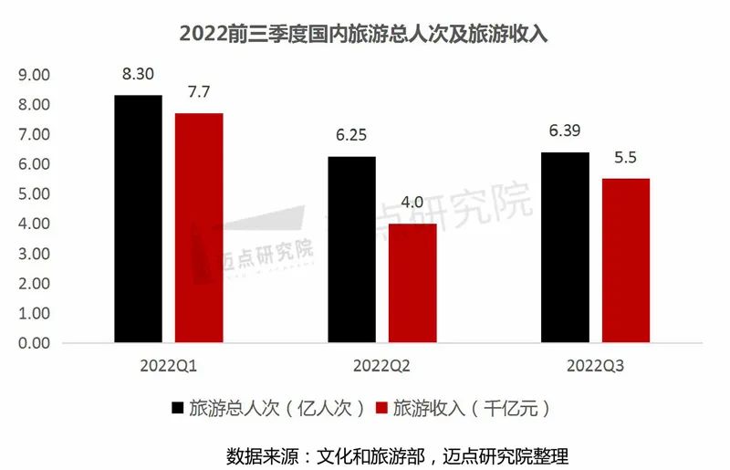 近日,文化和旅游部公布2022年前三季度国内旅游数据情况:前三季度,国内旅游总人次20.94亿,比上年同期减少5.95亿,同比下降22.1%。分季度看,其中一季度国内旅游人次8.30亿,同比下降19.0%;二季度国内旅游人次6.25亿,同比下降26.2%;三季度国内旅游人次6.39亿,同比下降21.9%。前三季度,国内旅游收入(旅游总消费)1.72万亿元,比上年减少0.65万亿元,同比下降27.2%。分季度分析,一季度旅游收入0.77万亿元,二季度旅游收入0.40万亿元,三季度旅游收入0.55万亿元。