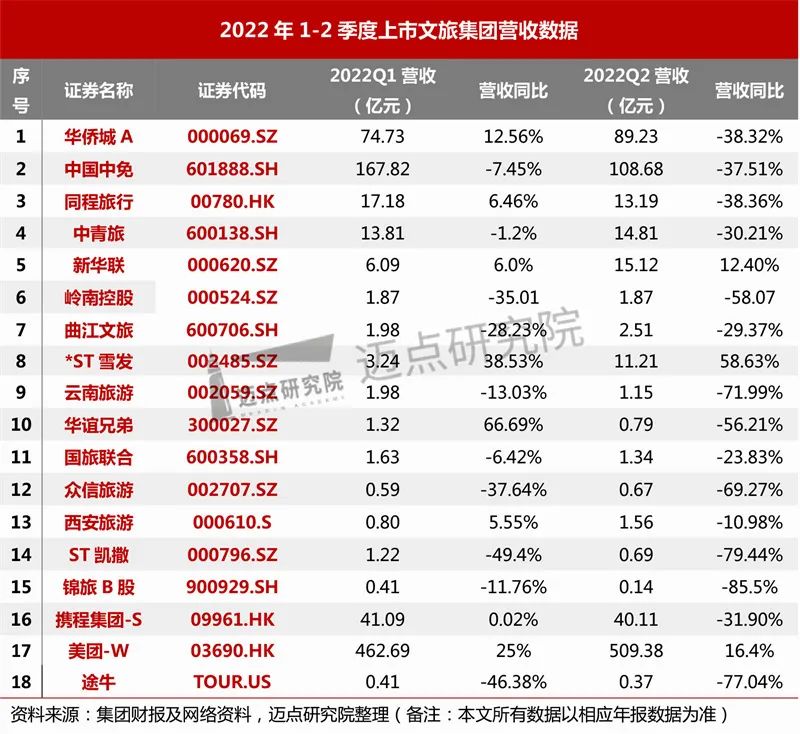 2022上半年文旅集团营收对比:头部企业的领先优势显著,持续转型探索新发展动能