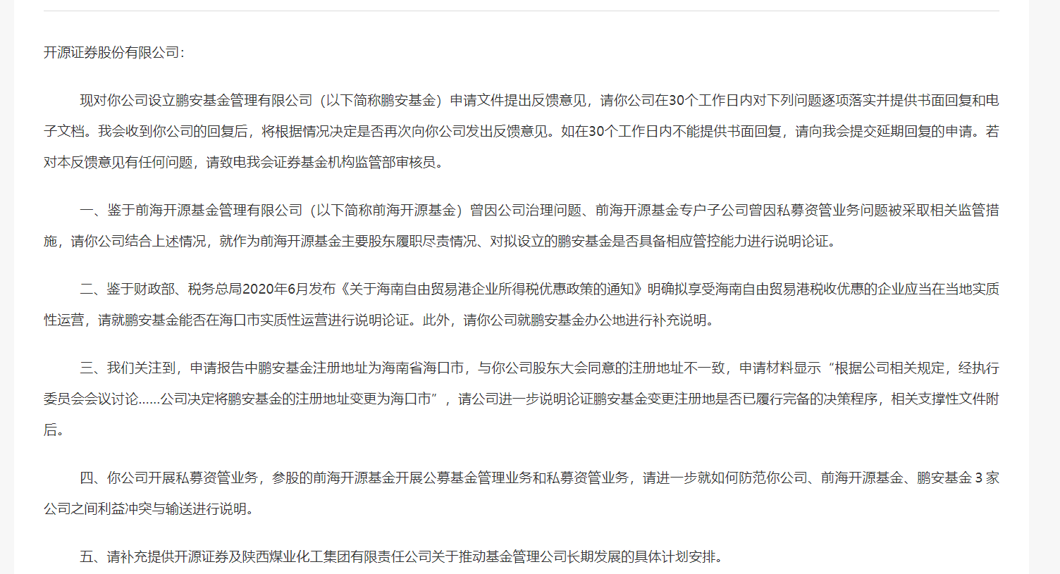 此外,对于鹏安基金的注册地在海口市,和公司股东大会同意的注册地址不一致;开源证券入股鹏安基金有关情况的说明与承诺等问题,证监会均给予了反馈意见。