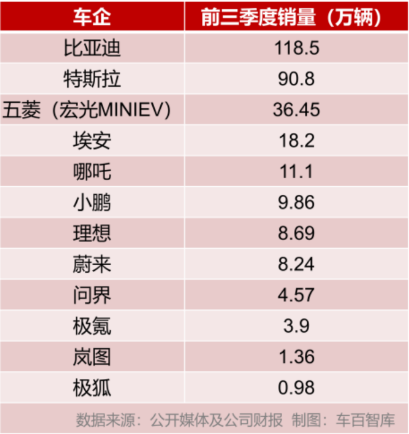今年前三季度,埃安售出18.2万辆新能源汽车,销量仅次于比亚迪、特斯拉与五菱宏光,而且比蔚小理三家中任意两家销量之和都高。