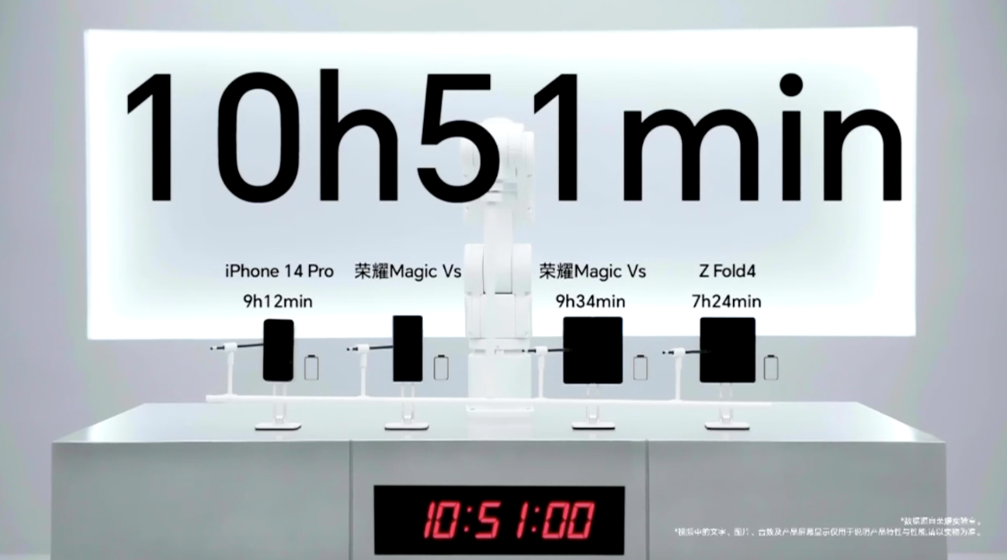 而除了在系统上的升维,荣耀Magic Vs在轻薄长续航上也做到极大的平衡。在发布会上,荣耀Magic Vs和其他手机重度续航测试对比,荣耀Magic Vs可持续带电10小时51分钟,相对iPhone 14 Pro可多用1.7小时,相对Z Flod 4可多用2.2小时,作为双屏的折叠屏来说,荣耀Magic Vs续航能力正如赵明此前所说,达到前所未有的长续航。这也解决了折叠屏续航和轻薄不能共存的痛点问题。