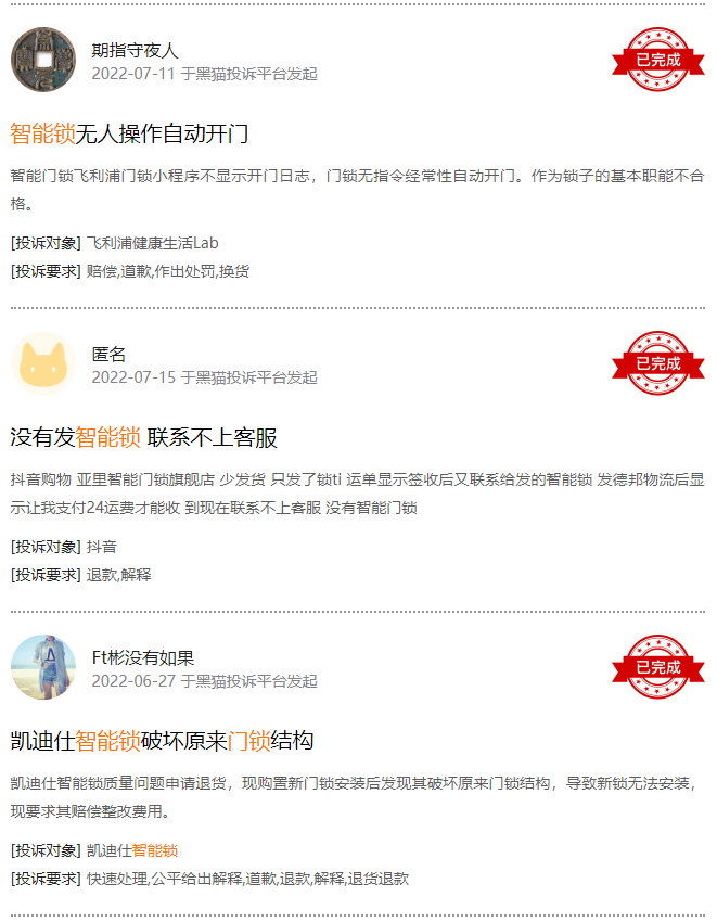 而据去年国家市场监督总局对12种网售门锁产品质量的调查报告显示,电子锁的不合格率为34.1%。在黑猫投诉平台上,消费者关于智能门锁和扫地机器人的投诉也频频出现。