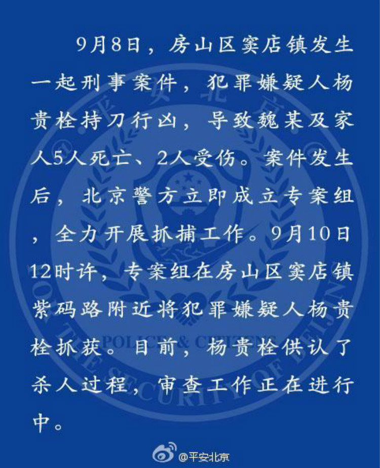 据北京市公安局官方微博消息称:9月8日,北京房山区窦店镇发生一起刑事案件,犯罪嫌疑人杨贵栓持刀行凶,导致魏某及家人5人死亡、2人受伤。9月10日12时许,犯罪嫌疑人杨贵栓已被抓获。