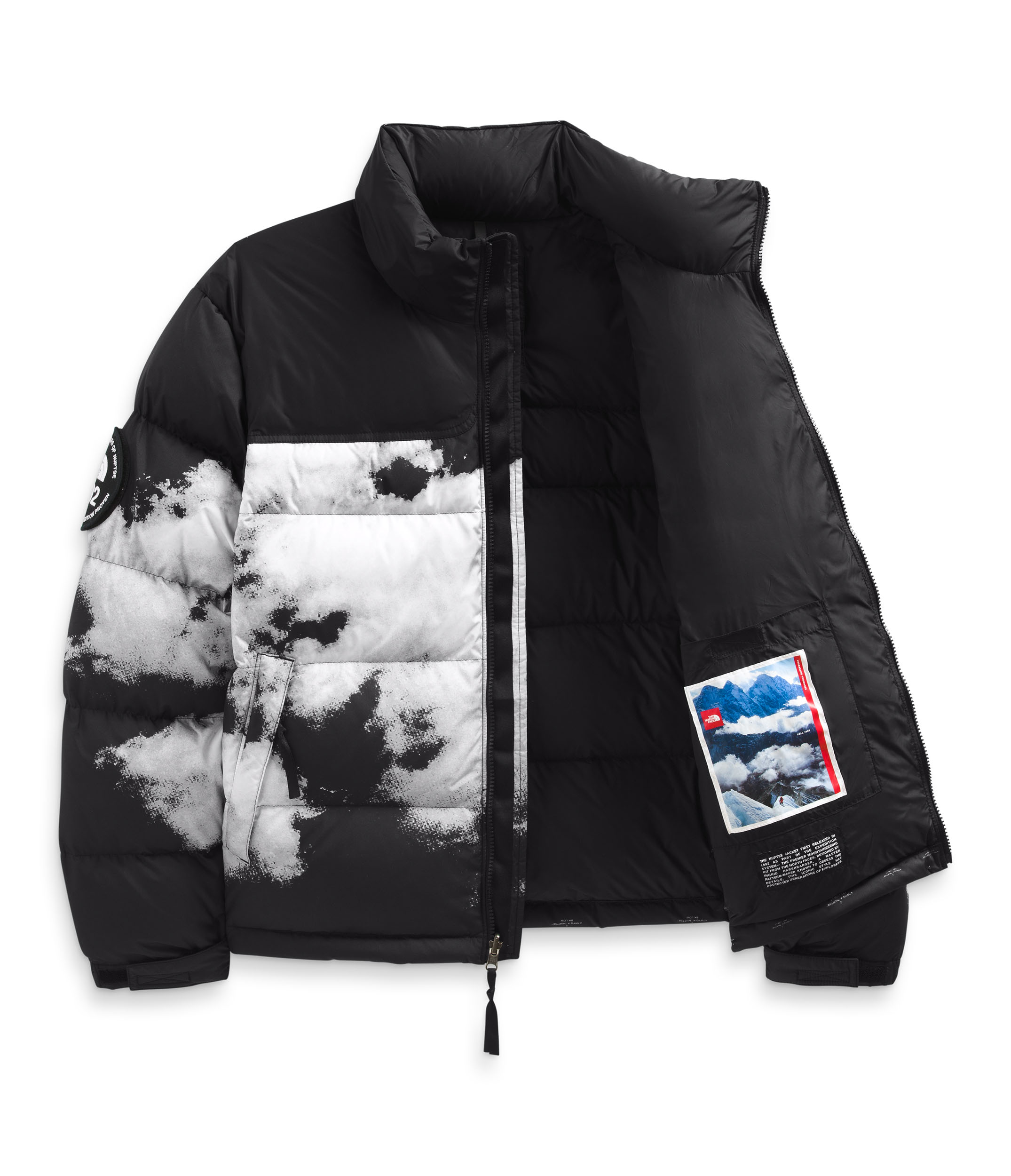 设计上,羽绒服上的云层印花与30周年限定版袖章搭配,突出限定款身份。