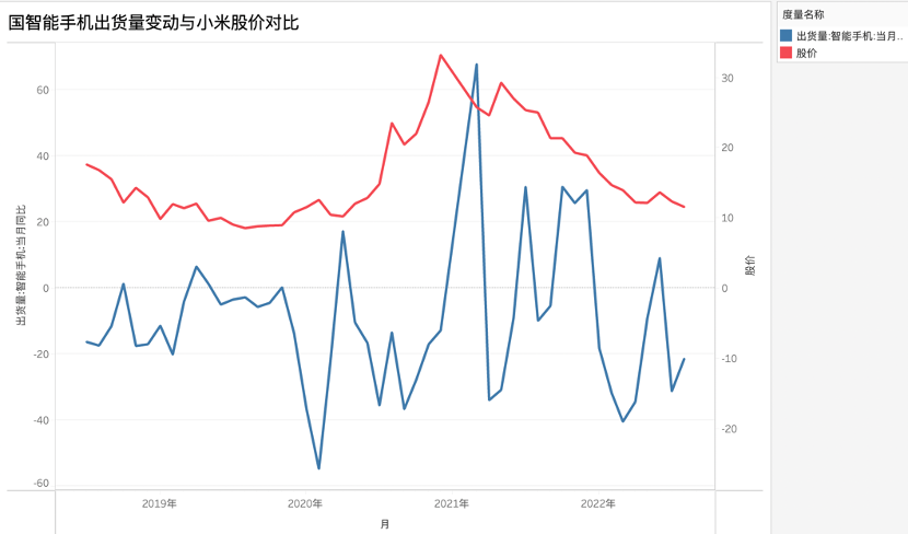 出于客观性对比,我们再将中国智能手机出货量变动与小米股价对比,见下图