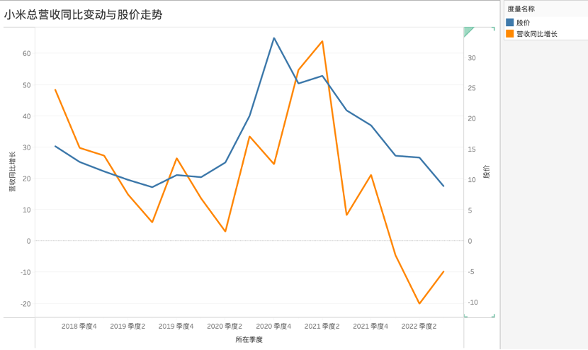 于是我们分别对比总营收同比增长与股价的走势情况,见下图