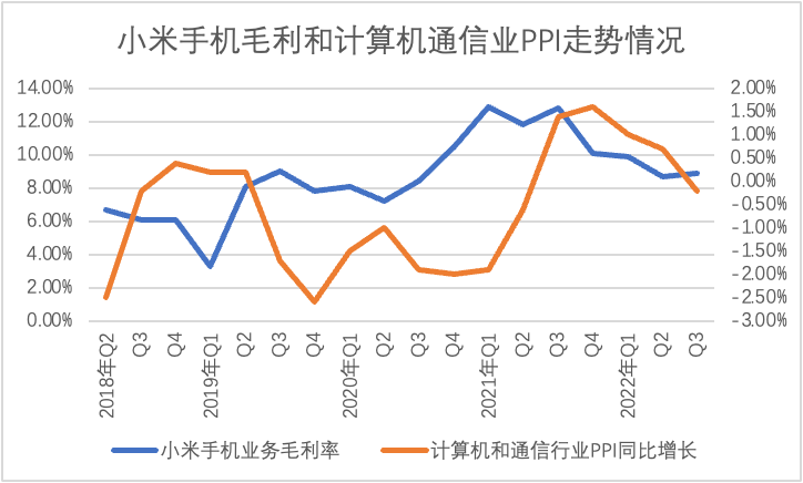 我们将小米手机毛利率与计算机通信行业的PPI(工业生产价格指数)走势进行对比,发现两者之间呈高度相关系,决定PPI走势的主要因素是生产和原材料成本,这些又与价格一起共同决定着产品的毛利率。