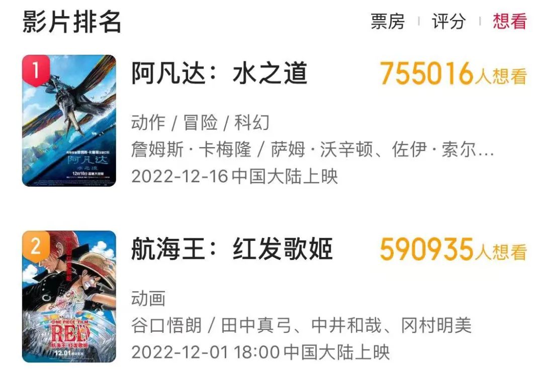 就在电影圈垂死挣扎之际,一个“救命”的重磅消息突然释出——包含《阿凡达2》在内的一批重磅进口片宣布定档12月。消息一出,《阿凡达2》的猫眼想看人数日增近10万。日漫大IP《航海王:红发歌姬》紧随其后,想看人数日增超8万。两部进口片均是在没怎么做宣传的情况下,就拥有如此猛烈的数据增长。可见,影迷也苦“片荒”久矣。