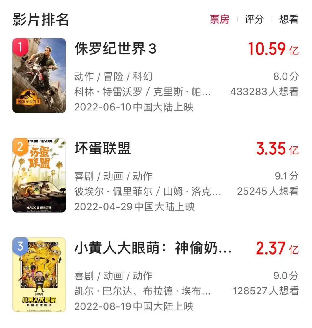 《侏罗纪世界3》于今年6月内地同步北美上映。在暑期档疫情反复、国产片相继撤档,进口片破例密钥延期上映两个月的情况下,还是仅收10亿出头的票房,远低于市场预期。要知道,四年前的《侏罗纪世界2》卖了16亿,七年前的《侏罗纪世界》卖了14亿。