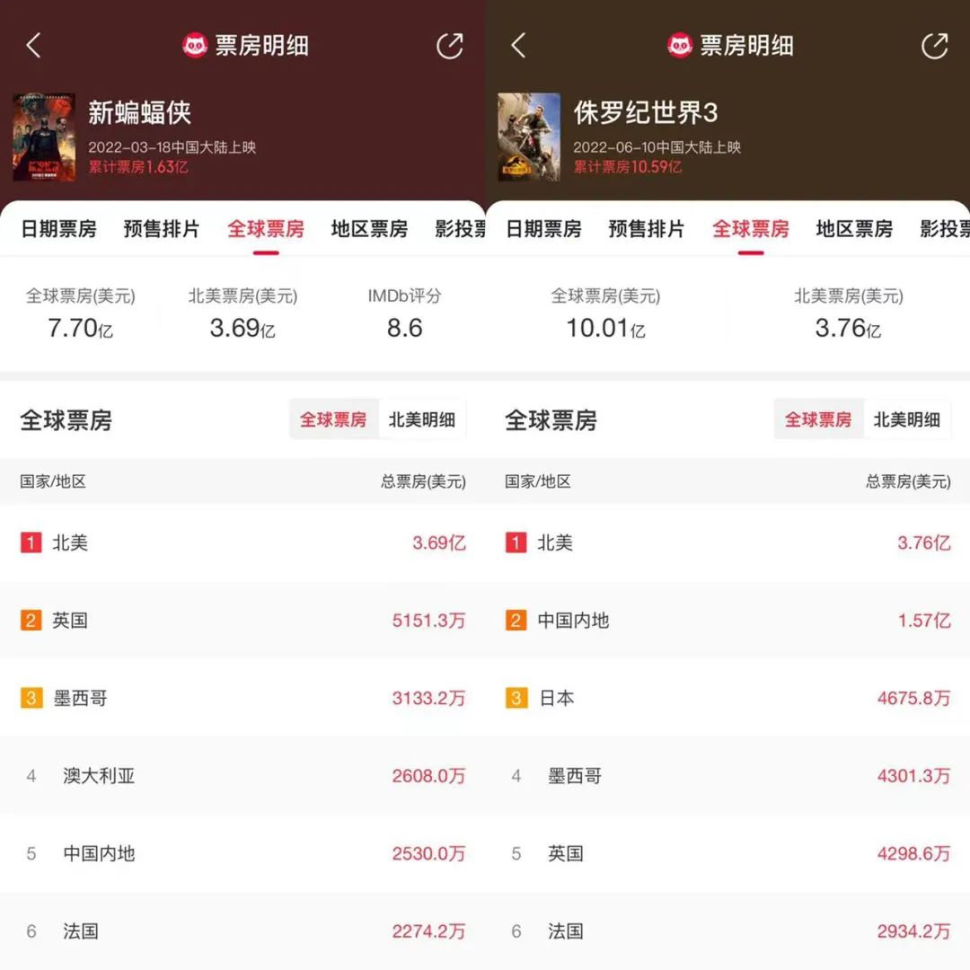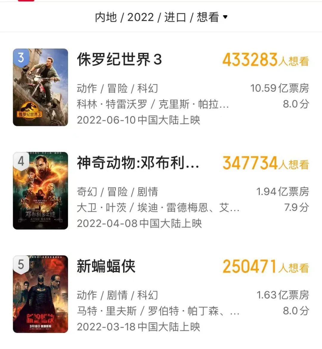另外的《侏罗纪世界3》《新蝙蝠侠》《神秘海域》都引进了。只不过,后两部在国内都卖得很差。《侏罗纪世界3》《新蝙蝠侠》在北美都卖了3.7亿美元左右,前者在国内卖了10亿人民币,后者只卖了1.6亿人民币。
