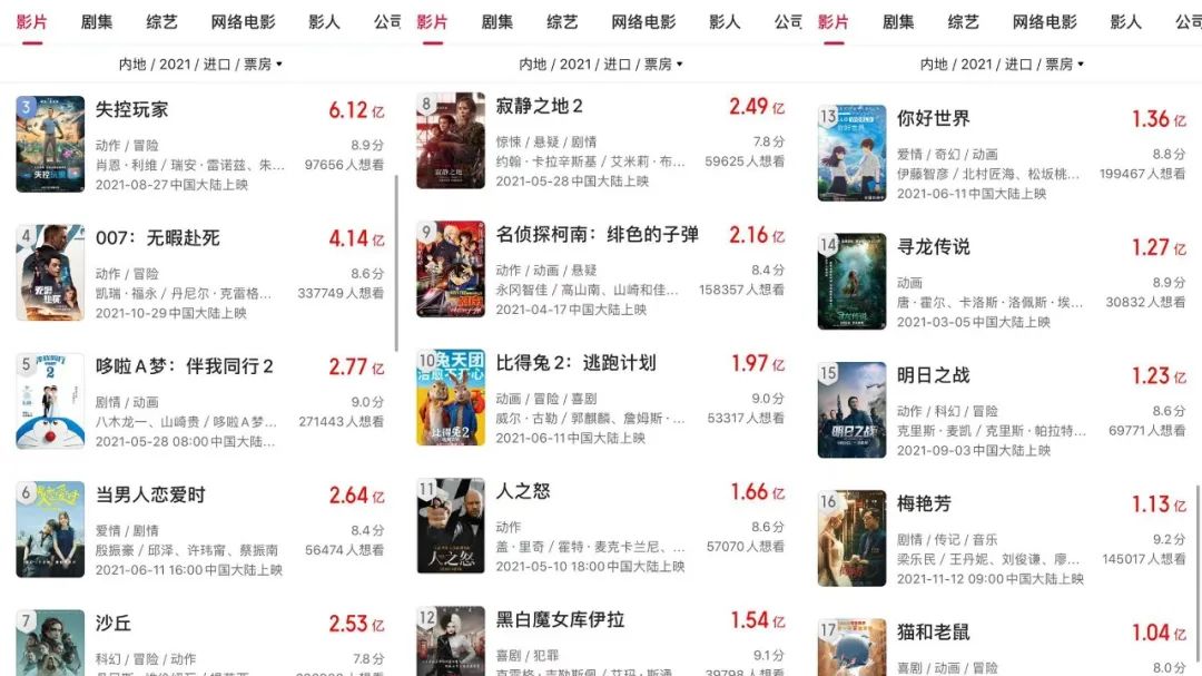 去年在1-10亿区间的中等体量影片有《失控玩家》《沙丘》《寂静之地2》,日本批片“常客”《名侦探柯南:绯色的子弹》《哆啦A梦:伴我同行2》,还有中国台湾黑马爱情片《当男人恋爱时》等。