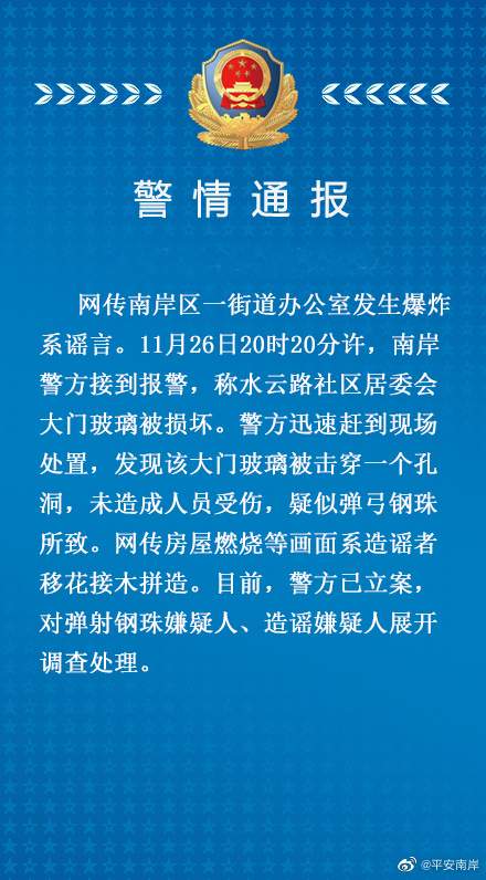 @平安南岸 微博11月27日消息,网传南岸区一街道办公室发生爆炸系谣言。