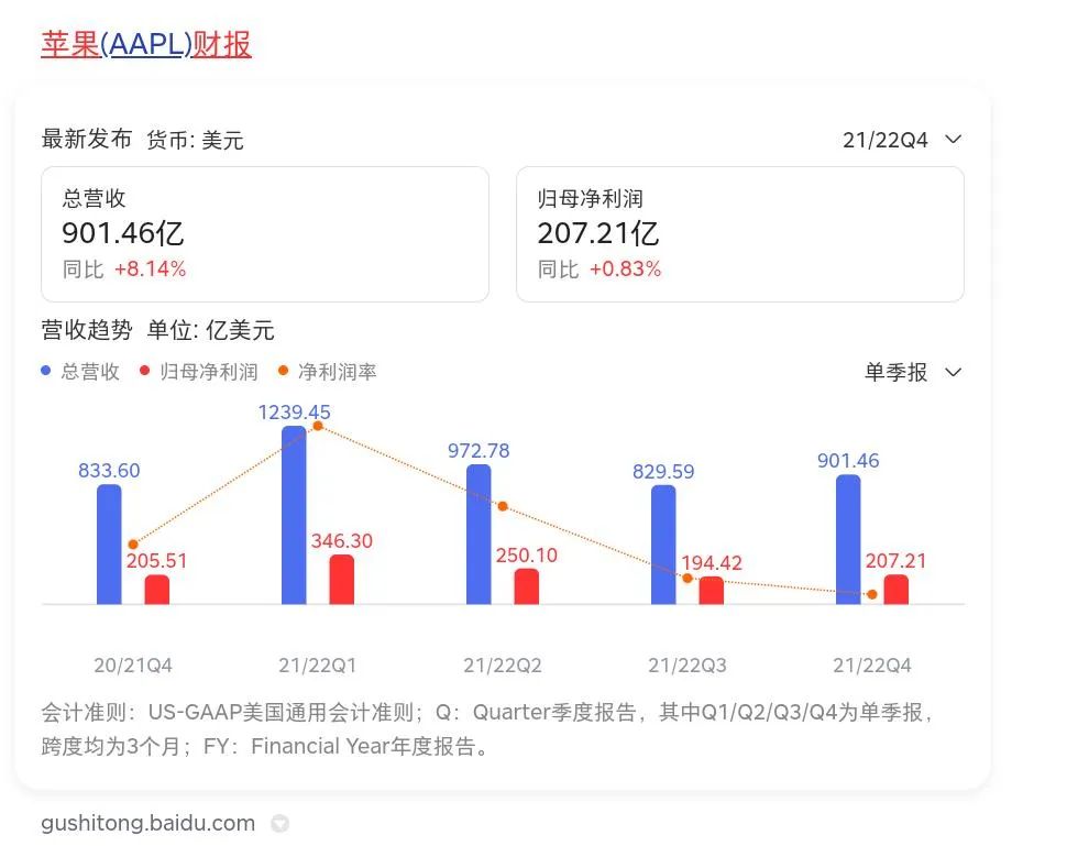 10月28日凌晨,苹果公司公布了2022财年第四财季(即第三季度)的业绩报告。报告显示,苹果在第四财季的总净营收为901.46亿美元,和去年同期相比增长了8.14%;净利润为207.21亿美元,相较去年同期增长0.83%。其中,苹果在大中华区的营收为154.70亿美元,与去年同期的145.63亿美元相比增长了6%。