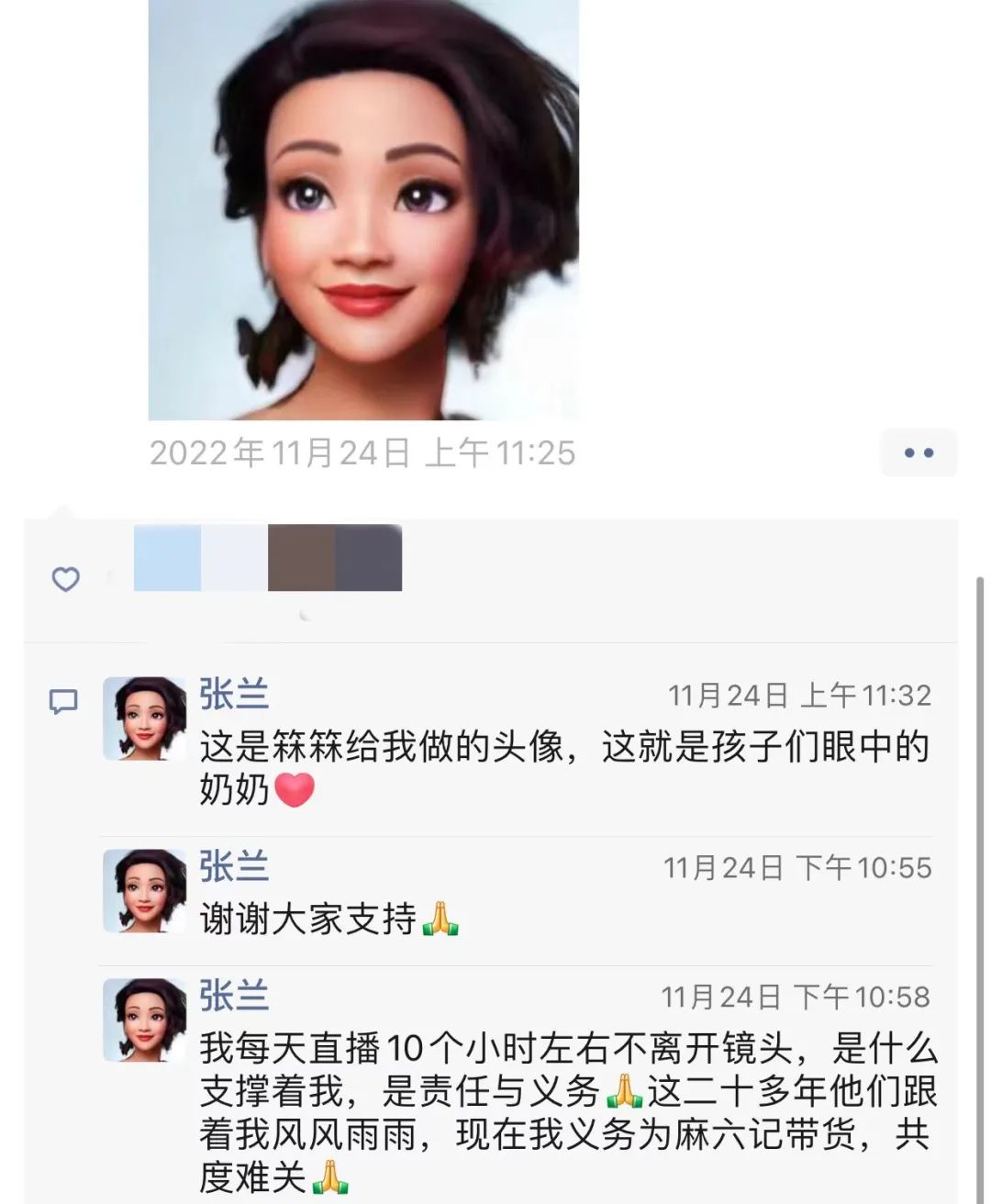 11月24日,张兰还更换了自己的微信头像,使用了汪小菲、大S的儿子汪希箖制作的照片。并在朋友圈表示,“这就是孩子们眼中的奶奶,谢谢大家支持。我每天直播十个小时不离开镜头,靠的是什么?是责任和义务。这二十年他们跟着我,现在我义务为麻六记带货,共度难关。”