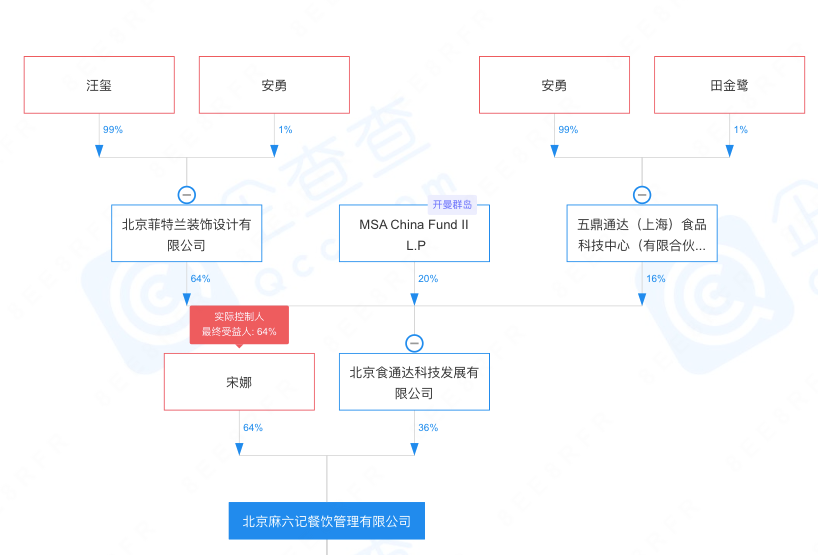 此外据企查查显示,麻六记的大股东、实际控制人为宋娜,持股64%。汪玺间接持股22.8%,汪玺也是北京俏江南投资控股有限责任公司的实际控制人,《每日经济新闻》报道,汪玺疑似为汪小菲父亲。