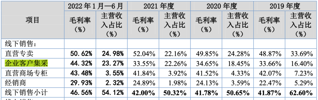从《招股书》来看,2019年-2021年以及2022年1月-6月,企业客户集采占主营收入的比例越来越高,分别是16.4%、18.45%、22.26%、23.27%。已经有要赶超直营专卖之势。