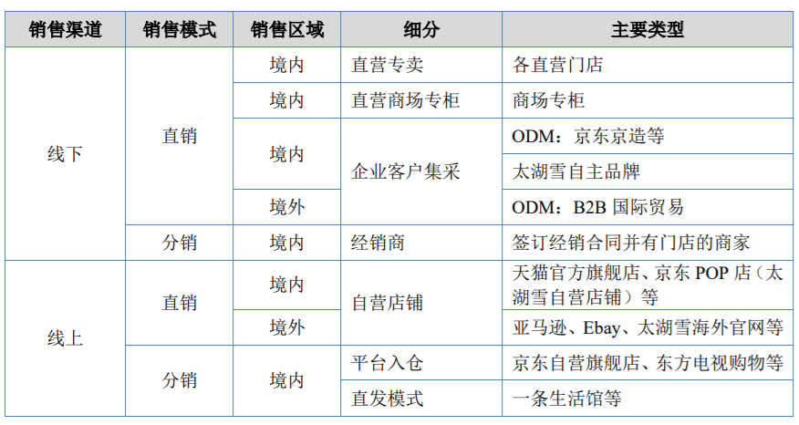 线上则主要通过天猫、京东、亚马逊、太湖雪海外官网、一条生活馆等电子商务平台以及东方电视购物进行线上销售。
