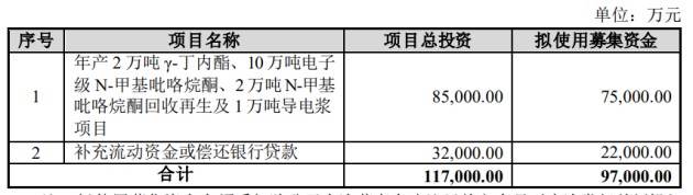 晶瑞电材本次向特定对象发行股票所募集的资金总额将不超过9.70亿元(含本数),扣除发行费用后,2.20亿元将用来补充流动资金或偿还银行贷款,7.50亿元将用于“年产2万吨γ-丁内酯、10万吨电子级N-甲基吡咯烷酮、2万吨N-甲基吡咯烷酮回收再生及1万吨导电浆”项目。