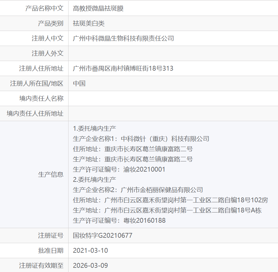 图:高教授微晶祛斑膜注册信息,截自国家药监局化妆品数据查询系统