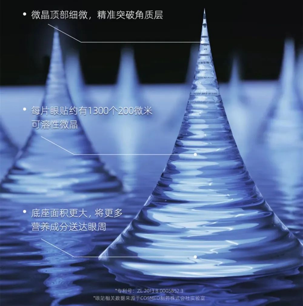 例如上文提到的多个品牌的眼膜产品,如俪龄之密、麦吉丽、中科思媄等,在使用时,眼膜贴在眼周,膜上的可溶性微针刺破表皮,一段时间后,针体与皮肤间质接触溶解,针体内的活性成分便由此递送到皮肤表皮下。