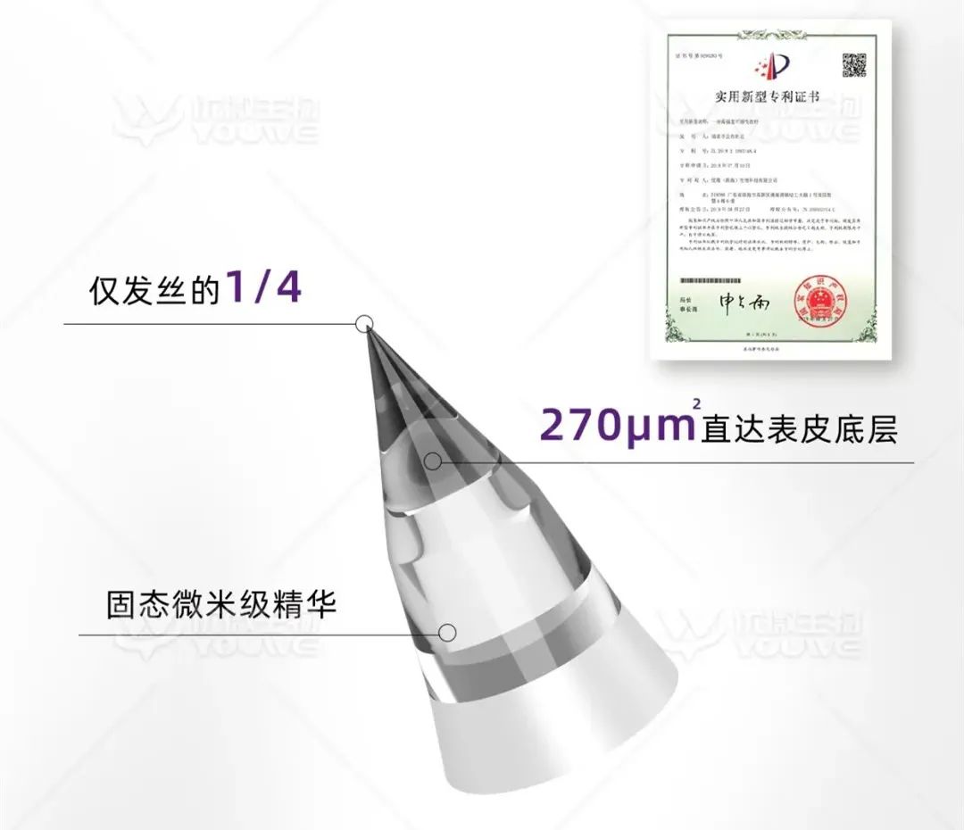 前段时间,优微生物便推出了独有的子弹头形状的微晶,能减少微晶体进入皮肤的阻力和增加渗入皮肤内的体积,并且在承载量和可承受的按压力度上都更优于其他形状。