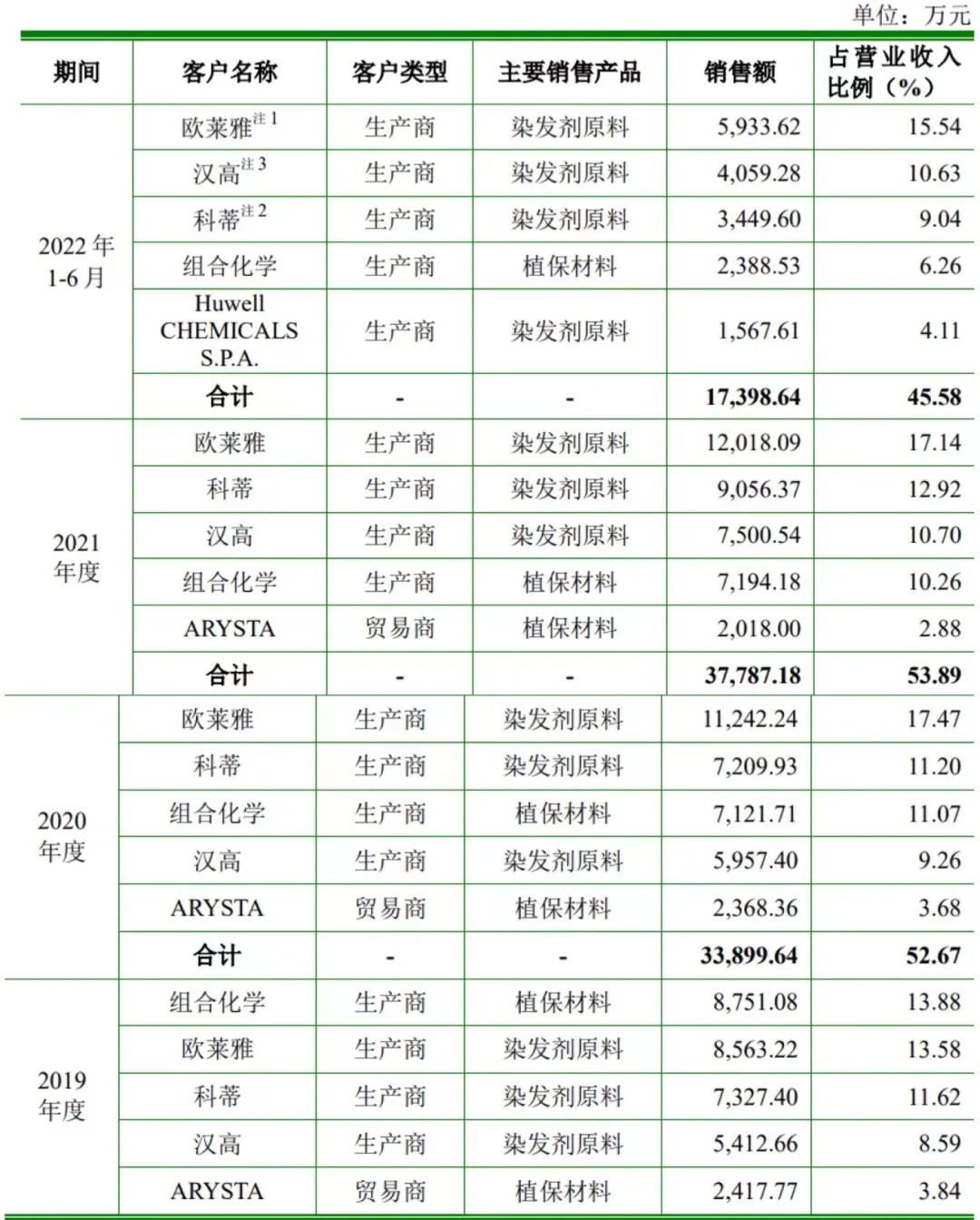 鼎龙科技在染发剂原料领域占据了一定的市场份额,系欧莱雅;汉高;科蒂等全球知名染发剂制造商的主要原料供应商。据招股书显示,公司对主要客户的销量占其染发剂原料采购量的 50% 以上。报告期内,鼎龙科技前五大客户销售收入占比分别为51.51%、52.67%、53.89%和45.58%,其中欧莱雅,科蒂、汉高也一直是前五大客户。2022年上半年,欧莱雅、汉高、科蒂三大客户对鼎龙科技所贡献的销售额分别为0.59亿元、0.41亿元和0.34亿元,占总营收比重分别为15.54%、10.63%、9.04%。
