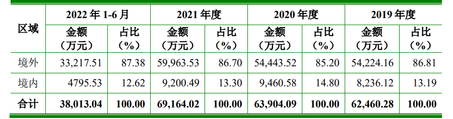 招股书显示,报告期内,鼎龙科技境外主营业务收入占比分别为86.81%、85.20%、86.70%和 87.38%。