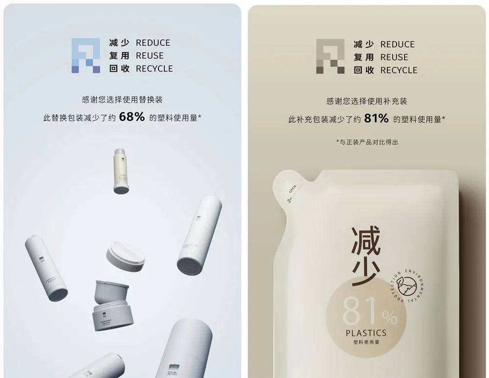 除了数字化工厂之外,国内新锐品牌虽然在基础资源上相对比较匮乏,但他们也在通过开发“替换芯”“可回收材料”“灌装瓶”等绿色包装形式,一步步落实可持续发展的目标。