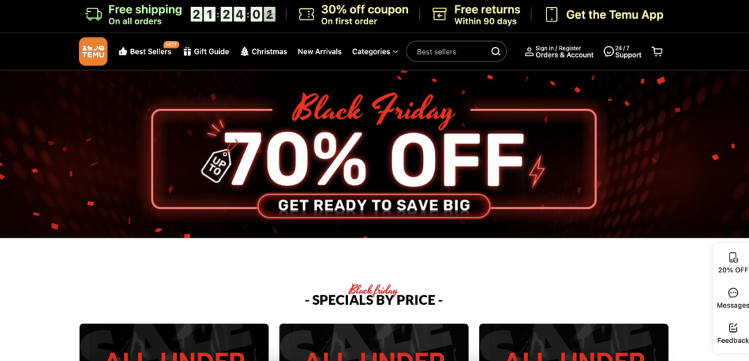 拼多多旗下跨境电商Temu今年9月正式进入美国,10月底Temu网站首页就出现了Black Friday Early Access的字样。在Temu黑五大促期间,“低价”贯穿始终:折扣最高达到70%,站内还有10美元、20美元、30美元专场。在物流方面,Temu在大促期间还举行满99元免运费活动,并为消费者提供“7日内送达”的物流选项,而一般来说,Temu上产品物流时间大约为7到15天。