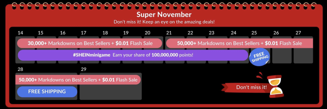 以时尚、低价而闻名的SHEIN在11月推出从14日到29日的“Super November”。其间,SHEIN的折扣力度高达85%,部分限时抢购商品只需0.01美元。对于黑五期间首次下单的用户,SHEIN还会提供更多积分点数、专属折扣等。