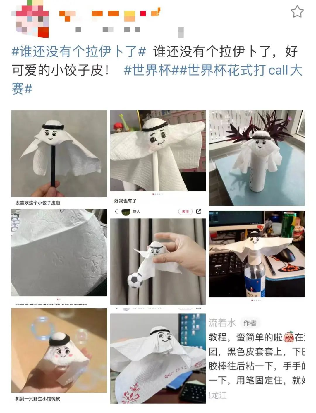 微博上,“拉伊卜可爱”“世界杯吉祥物”“世界杯饺子皮好可爱”等话题均获得上百万阅读量。小红书上,网友们开启了“捏饺子皮”大赛——各种平替版“拉伊卜”层出不穷。