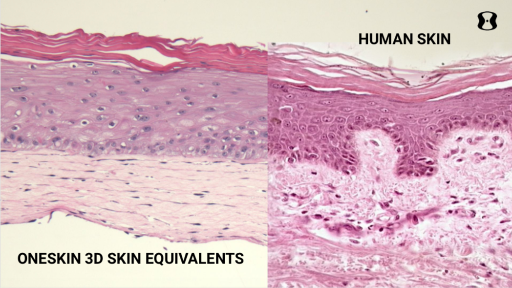 仿真皮肤模型 (Human Skin Equivalent)与真人皮肤切片的细胞结构对比,图片来自OneSkin官网
