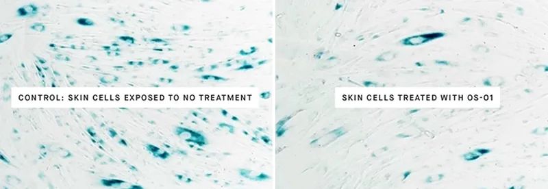 OneSkin的专利十肽(OS-01)经过多项临床试验证明除了拥有常见的增加皮肤弹性、刺激胶原蛋白生成、除皱保湿等功效外,最独特的是它可以经由降低衰老细胞(俗称“僵尸细胞” Senescent Cells)的累积降低皮肤的“生物年龄”,可以将衰老细胞减少多达25-50%以上。让皮肤不仅仅是看上去更年轻了,而是修复细胞,尤其是紫外线造成的损伤,从功能上真正让皮肤年轻,延长皮肤的生命周期。